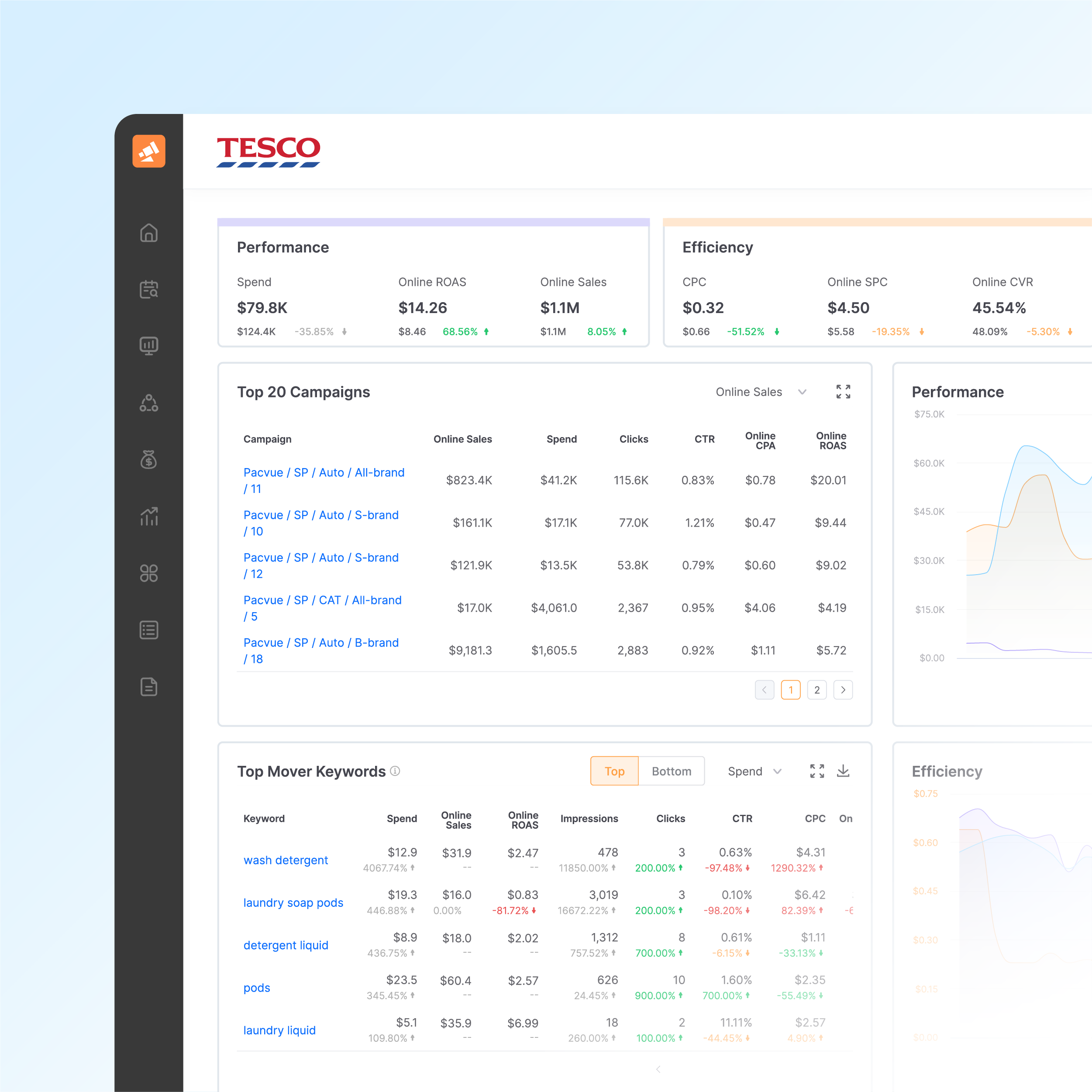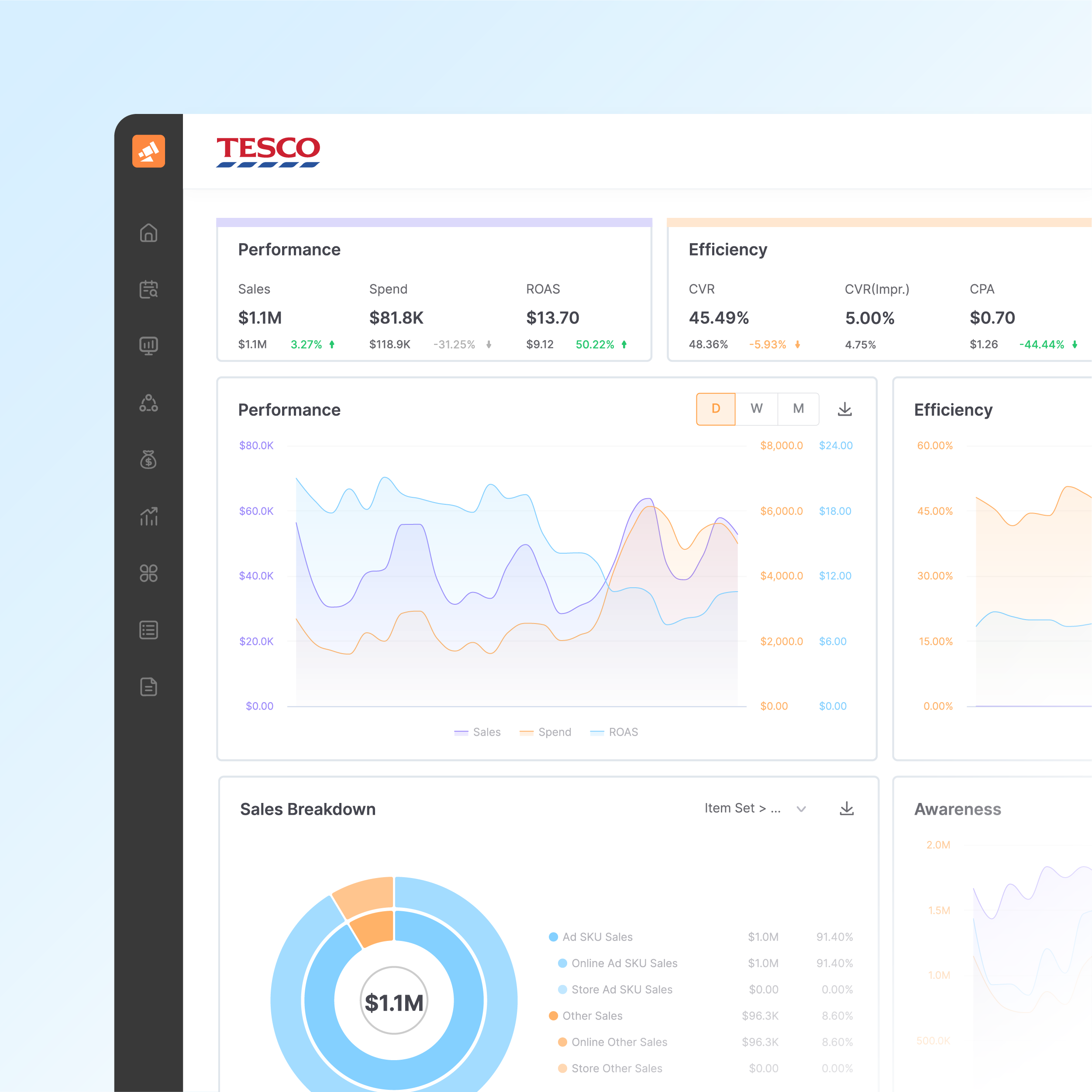 単一のプラットフォーム上で、統合されたデータ、リアルタイムのパフォーマンス指標、自動化された実行機能を活用し、Tescoの検索、閲覧、決済の各段階におけるブランドのパフォーマンスを自在に管理しましょう。