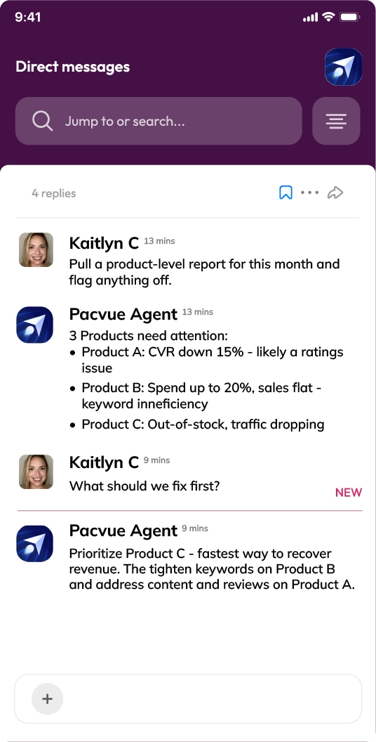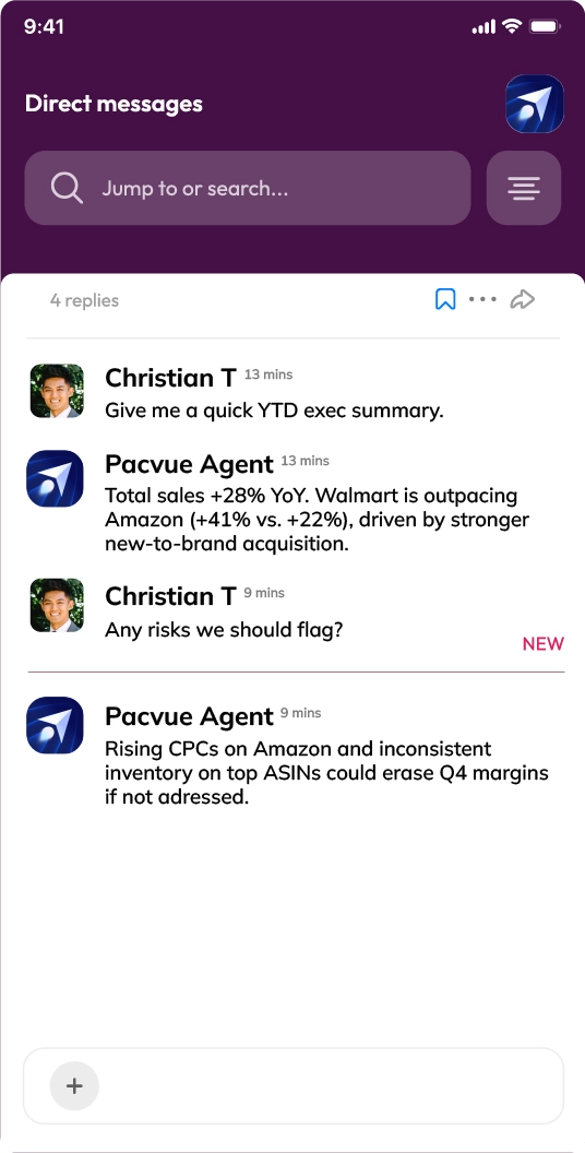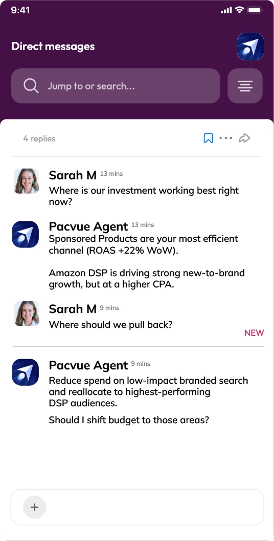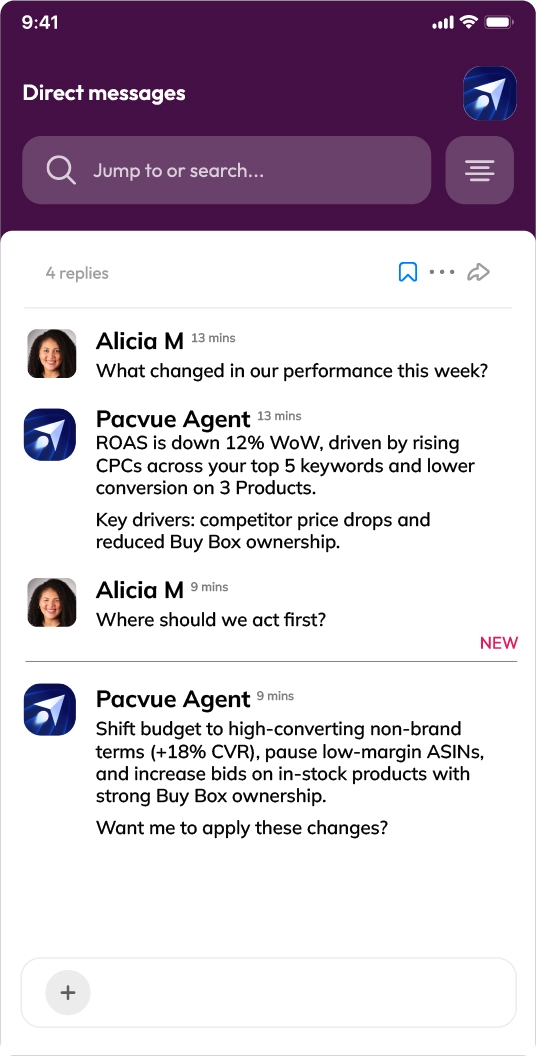 Pacvue Agent works within the Pacvue platform and in Slack, so your team gets the same trusted intelligence in both places. Ask questions, get performance diagnostics, and initiate next steps right where decisions are already happening. This means less context switching and faster alignment when performance shifts.