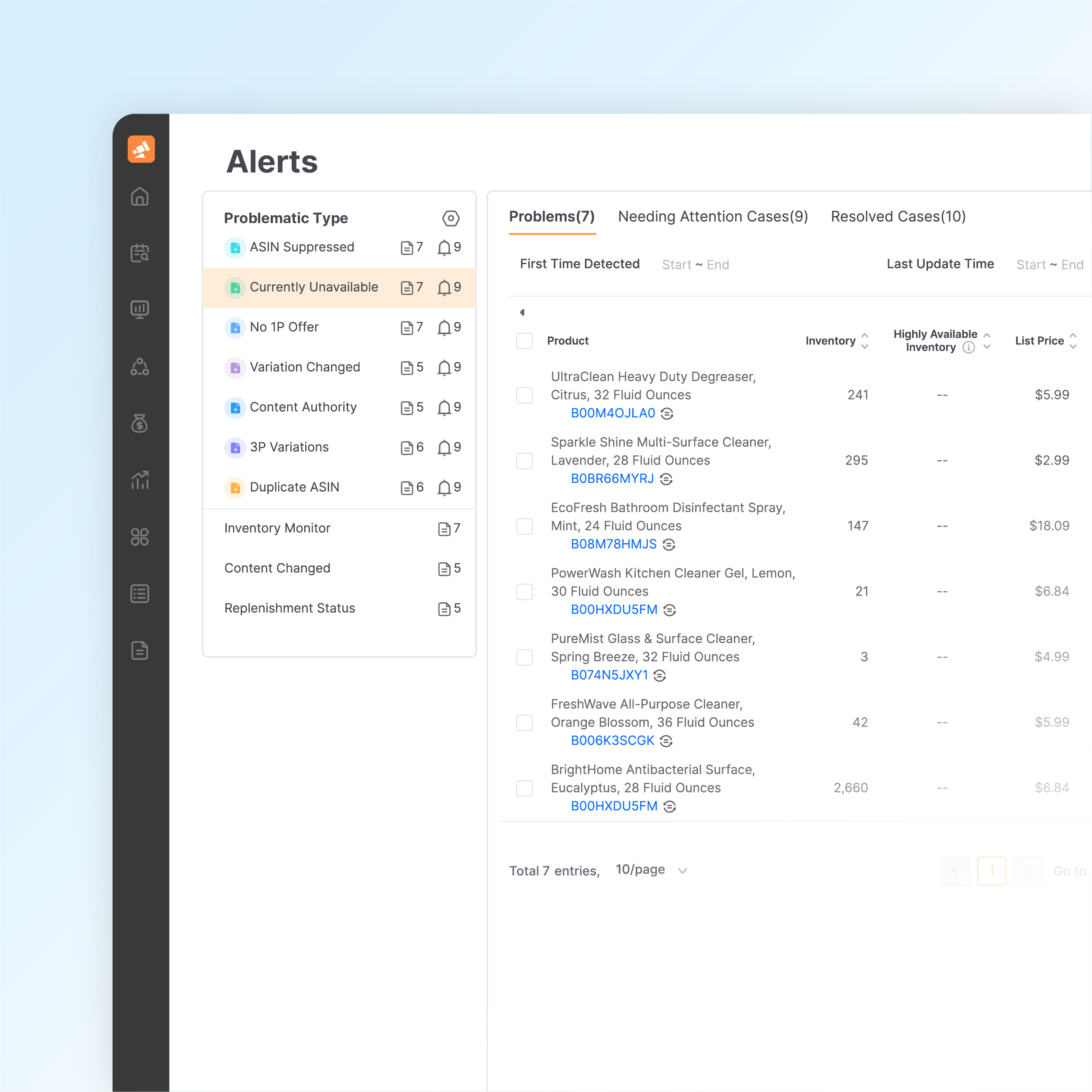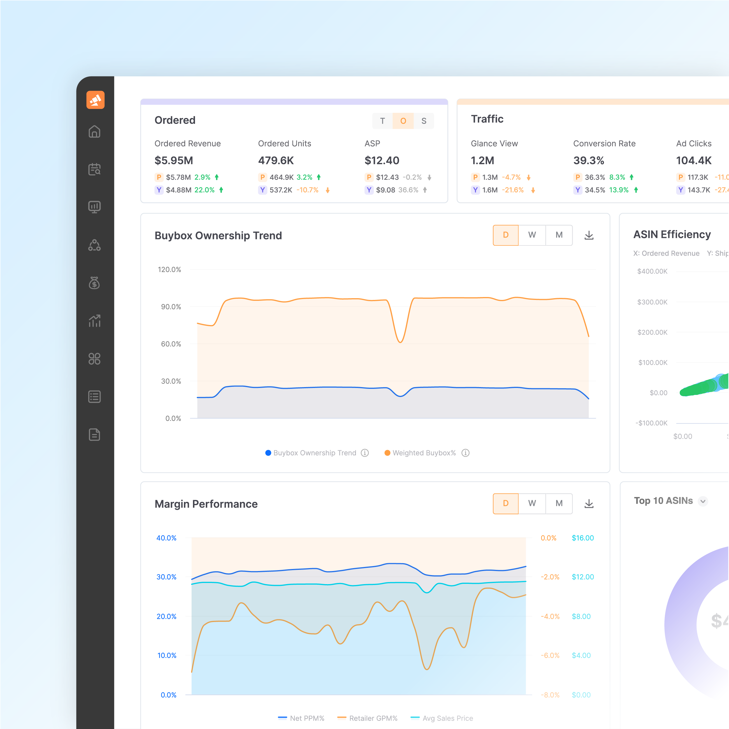 AI-prioritized alerts for OOS risk, Buy Box shifts, traffic drops, and margin pressure ranked by impact.